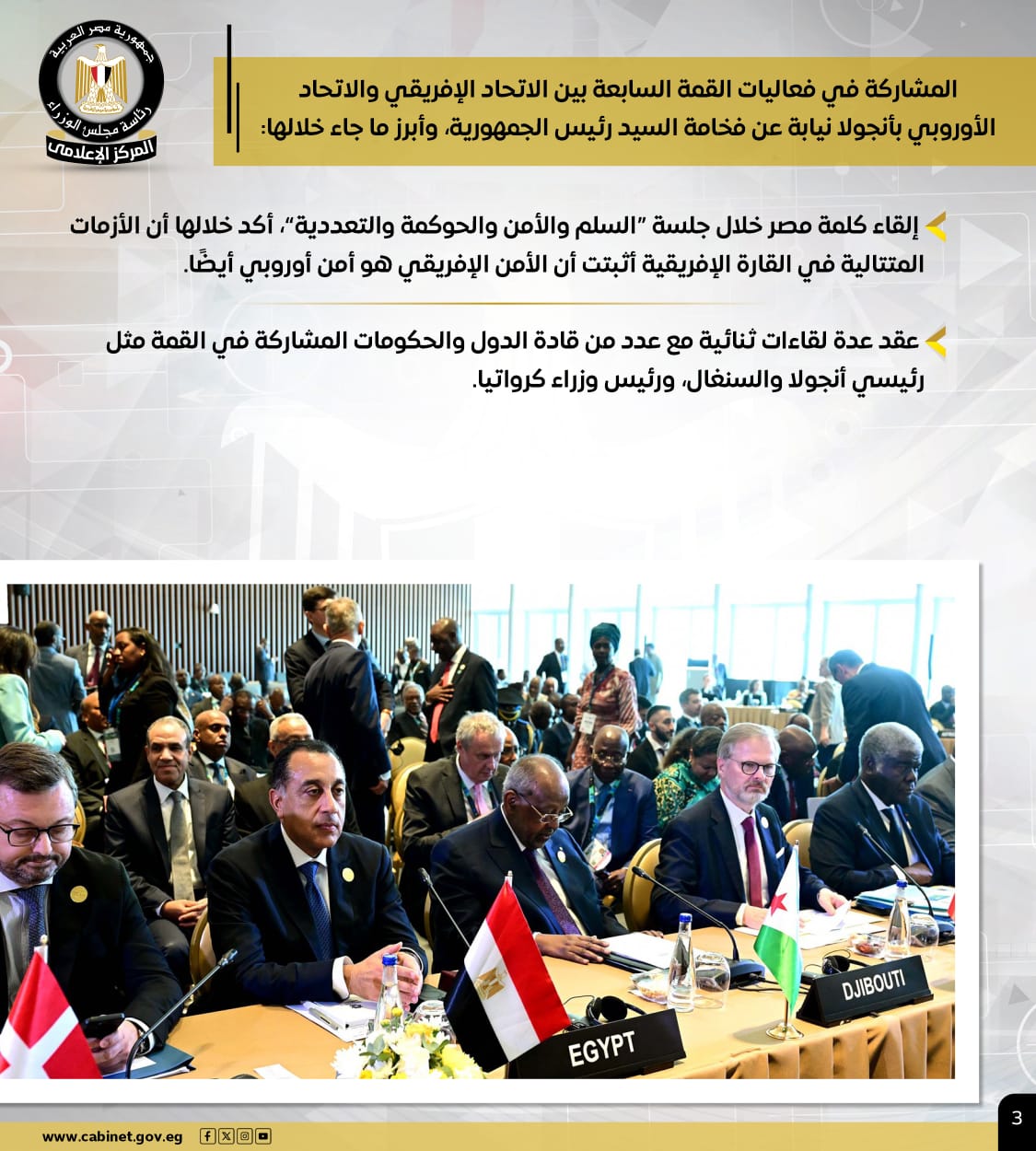 وشملت الأنشطة مشاركة في فعاليات القمة السابعة بين الاتحاد الإفريقي والاتحاد الأوروبي بأنجولا نيابة عن الرئيس، حيث ألقى كلمة مصر خلال جلسة "السلم والأمن والحوكمة والتعددية"، مؤكدًا أن الأزمات المتتالية في القارة الإفريقية أثبتت أن الأمن الإفريقي هو أمن أوروبي أيضًا، كما عقد عدة لقاءات ثنائية مع عدد من قادة الدول والحكومات المشاركة في القمة.