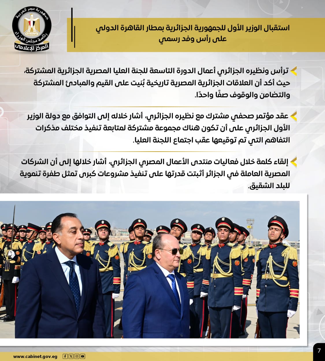 وتضمنت الأنشطة، استقبال للوزير الأول للجزائر بمطار القاهرة الدولي على رأس وفد رسمي، حيث ترأس ونظيره الجزائري أعمال الدورة التاسعة للجنة العليا المصرية الجزائرية المشتركة، مؤكدًا على أن العلاقات الجزائرية المصرية تاريخية بُنيت على القيم والمبادئ المشتركة والتضامن والوقوف صفًا واحدًا.