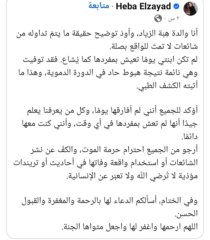 وأكدت والدة هبة الزياد أن ما تم تداوله بشأن وفاة ابنتها “غير دقيق”، مشيرة إلى أن رحيلها كان طبيعيًا؛ نتيجة هبوط حاد في الدورة الدموية أثناء نومها.
