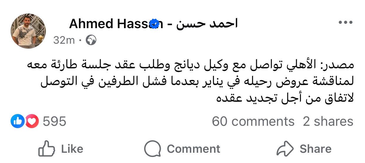وكتب أحمد حسن على حسابه بموقع فيسبوك: “مصدر: الأهلي تواصل مع وكيل ديانج وطلب عقد جلسة طارئة معه لمناقشة عروض رحيله في يناير بعدما فشل الطرفين في التوصل لاتفاق من أجل تجديد عقده”.