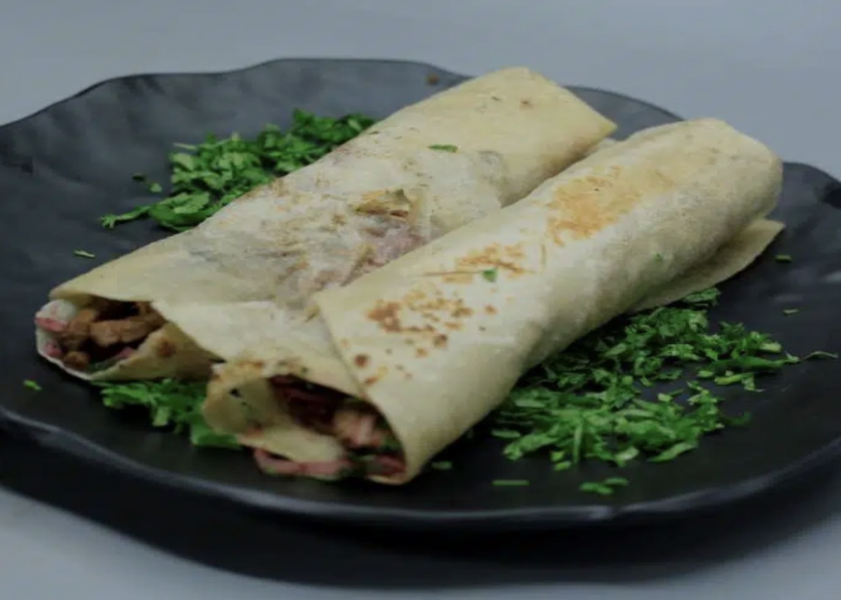 في عيش صاج يوضع قليل من الخليط السابق ثم قليل من شاورما لحمة.