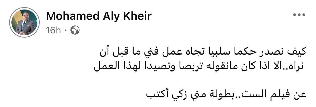 وكتب خير على حسابه الخاص بموقع فيسبوك: “كيف نصدر حكمًا سلبيًا تجاه عمل فني ماقبل أن نراه، إلا إذا كان ما نقوله تربصًا وتصيدًا لهذا العمل .. عن فيلم الست بطولة منى زكي أكتب”.