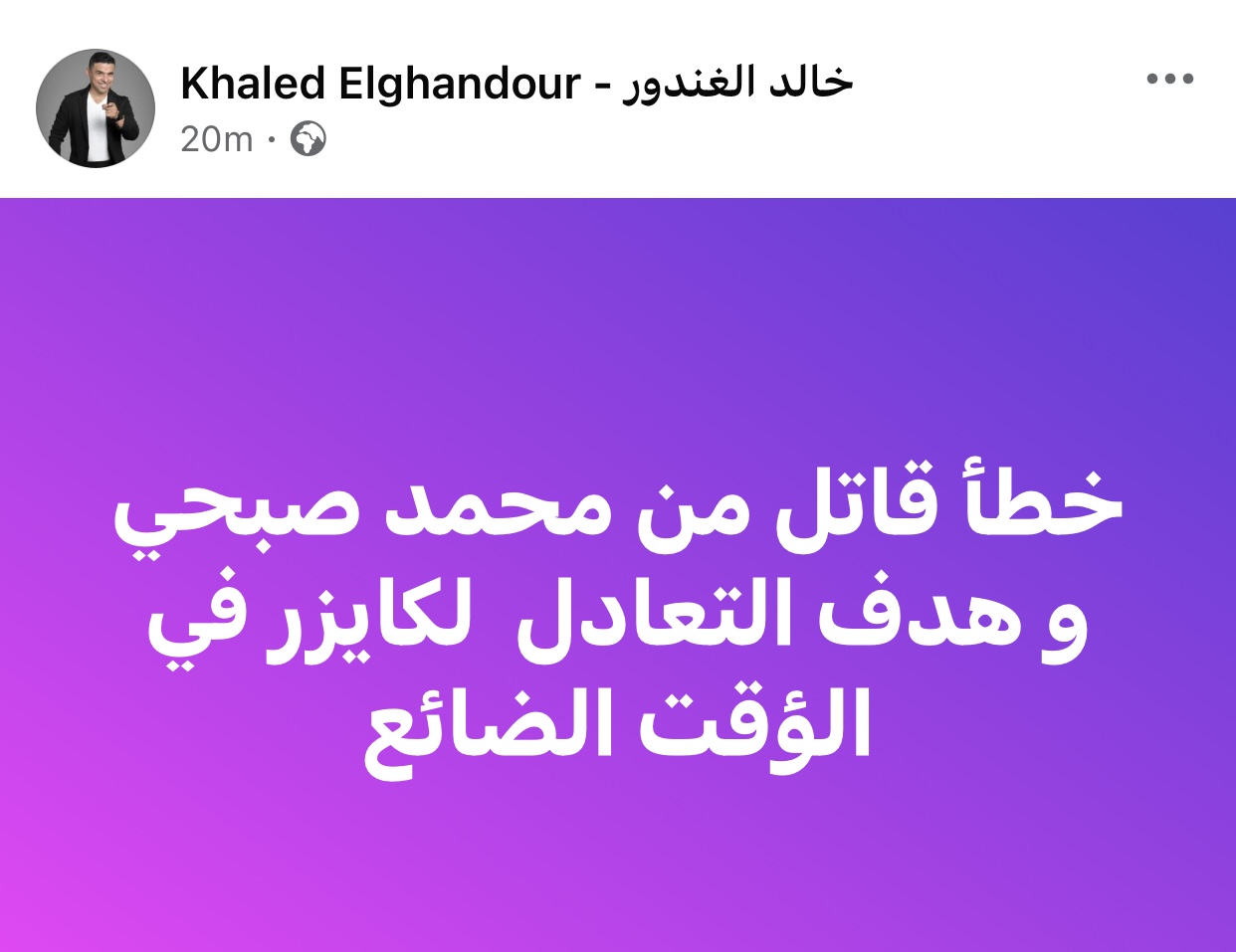 وكتب الغندور عبر حسابه الشخصي بموقع فيسبوك: "خطأ قاتل من محمد صبحي وهدف التعادل لكايزر في الؤقت الضائع".