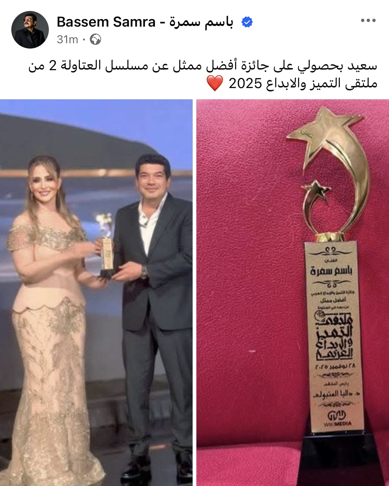 وعلق باسم سمرة على الصور،: "سعيد بحصولي على جائزة أفضل ممثل عن مسلسل العتاولة 2 من ملتقى التميز والإبداع 2025".