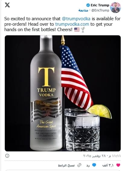 أعلن إريك ترامب، نجل الرئيس الأمريكي دونالد ترامب، عن بدء تلقي الطلبات المسبقة لشراء فودكا جديدة تحمل اسم Trump Vodka، وأكد إريك ترامب عبر منصة "إكس": "يسرني أن أعلن أن فودكا ترامب متاحة الآن للطلب المسبق".