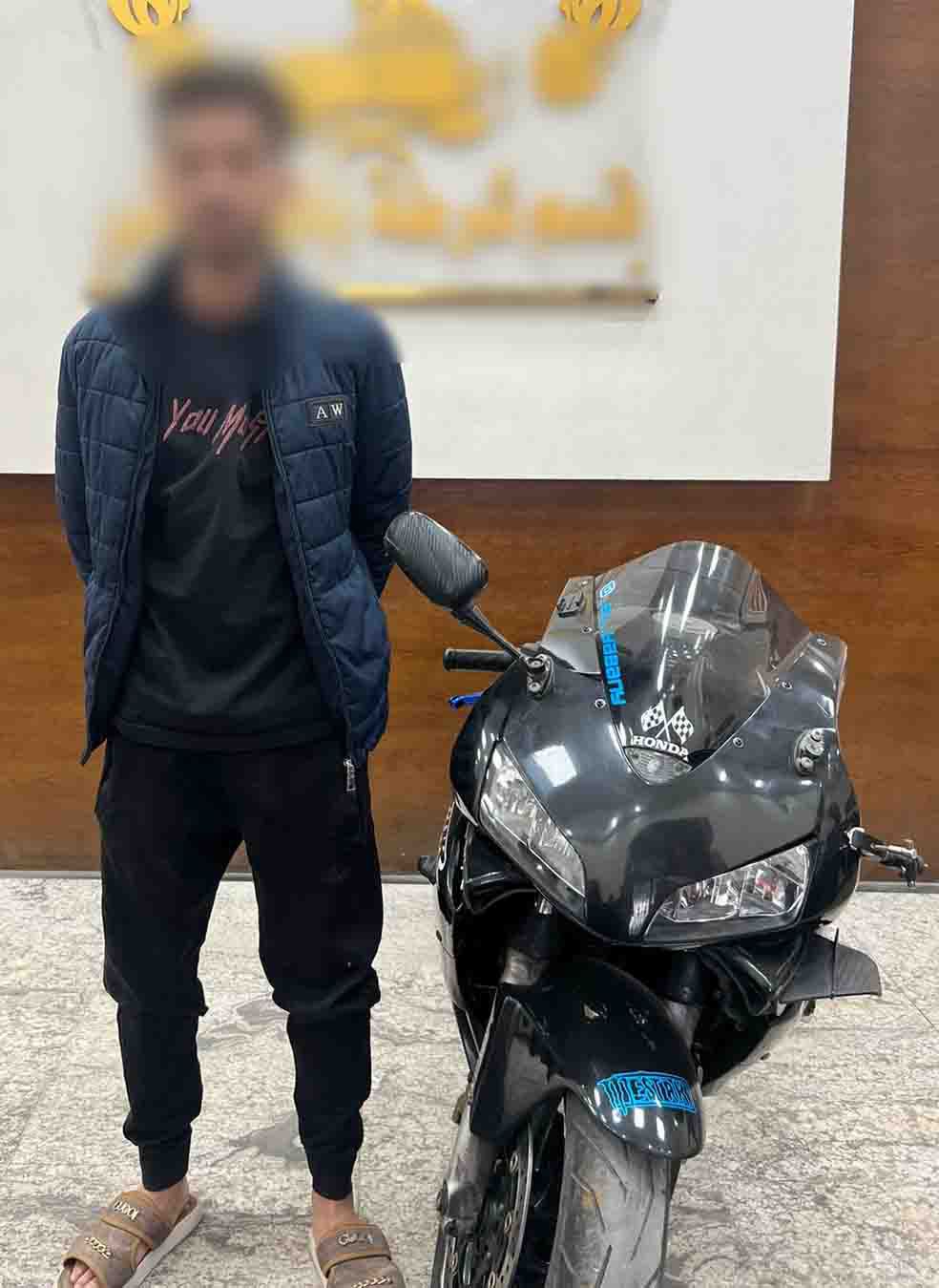 بالفحص أمكن تحديد وضبط الدراجة النارية الظاهرة بمقطع الفيديو "بدون تراخيص" وقائدها (عامل "له معلومات جنائية" – مقيم بدائرة قسم شرطة باب شرق).