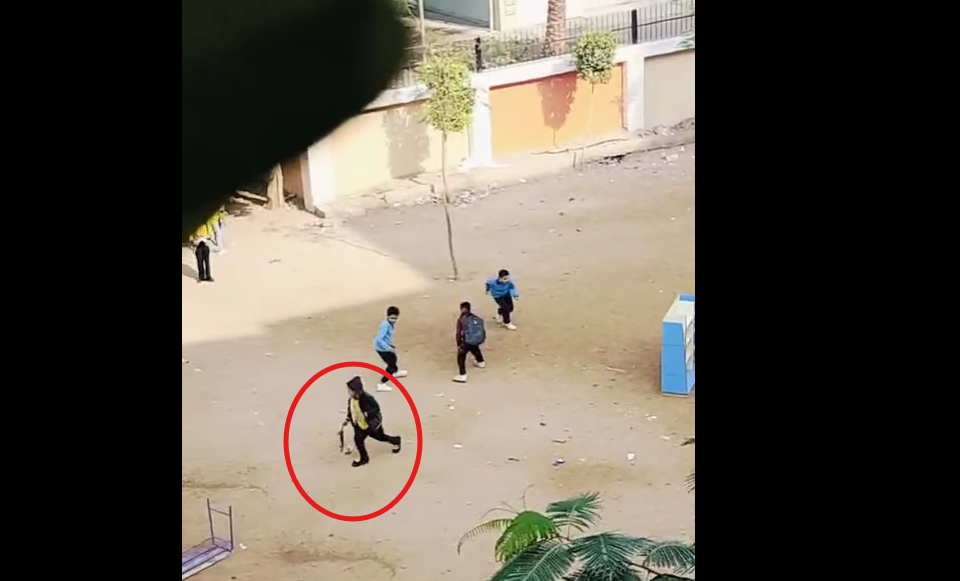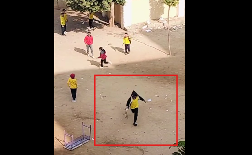 الفيديو المتداول تم تصويره في مجمع مدارس شهداء الحرية بكفر الجبل في الهرم ، حيث يظهر فيه أحد الطلاب يحمل “قطة ميتة” داخل فناء المدرسة ويجري بها وراء زملائه ليخيفهم بها ، في مشهد فوضوي لا تظهر به أي رقابة من المدرسة أو حضور لأحد المشرفين.
