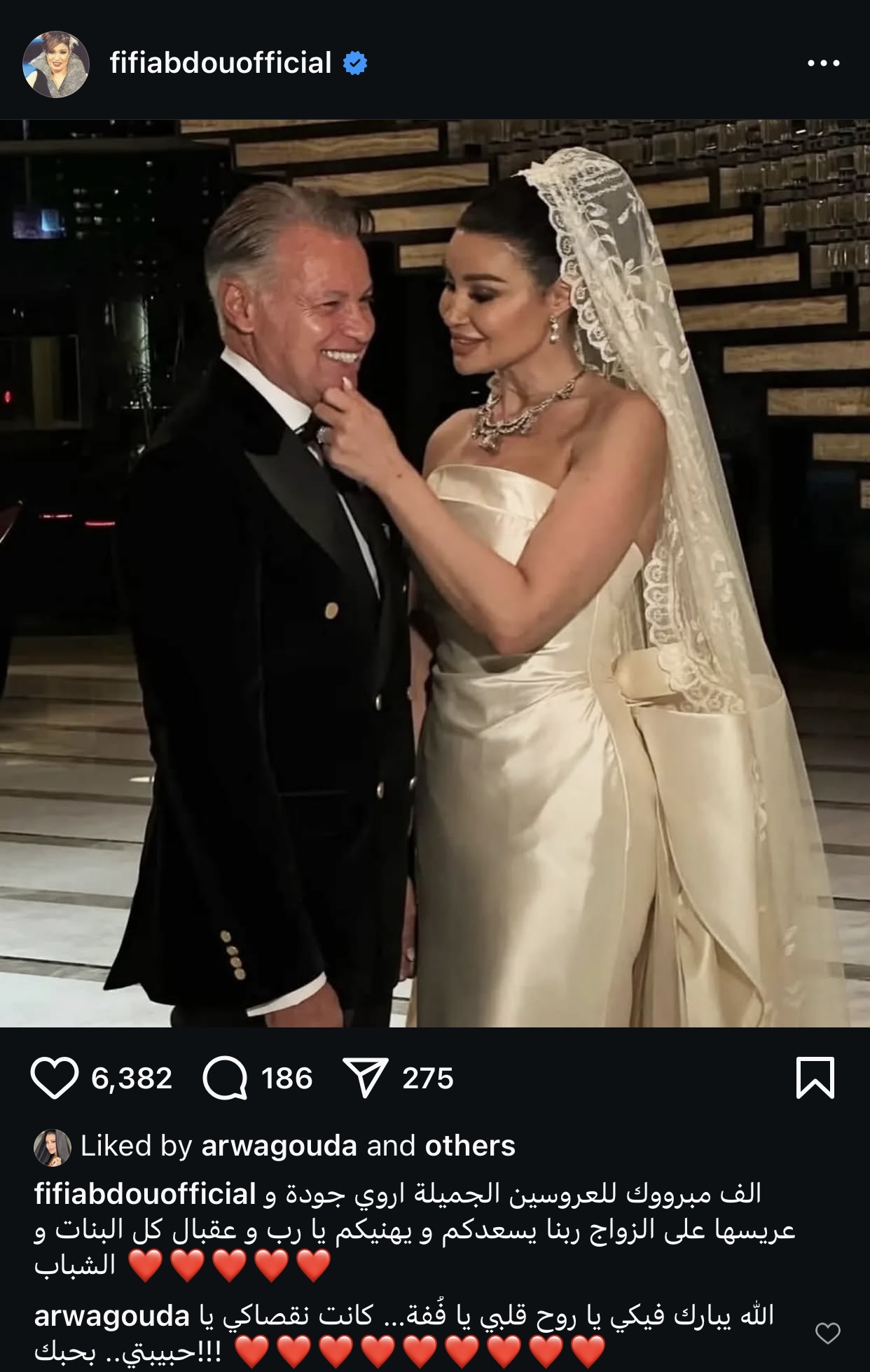 وهنأتها فيفي عبده قائلة: “ألف مبروك للعروسين الجميلة اروى جودة وعريسها على الزواج ربنا يسعدكم ويهنيكم يارب وعقبال كل البنات والشباب”.