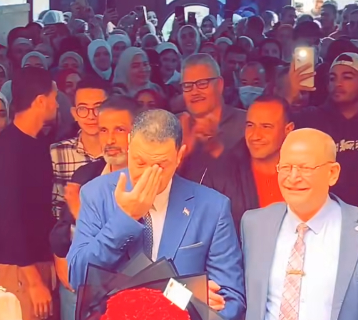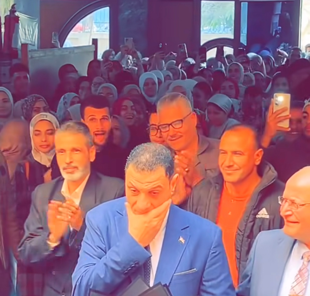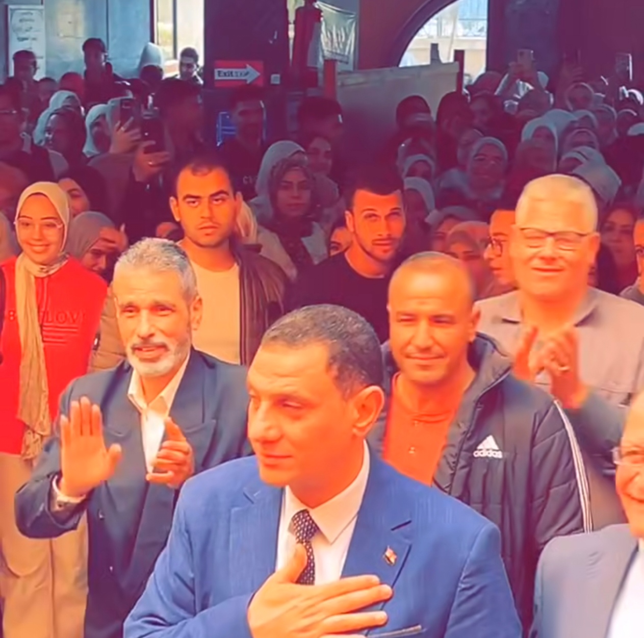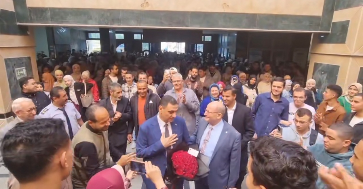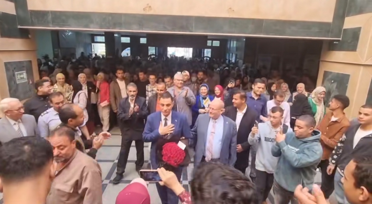 واستقبل الطلاب الدكتور ياسر كمال بالورود والزغاريد حيث نظموا ممرا شرفيا من امام بوابة المجمع النظري وحتي كلية العلوم.