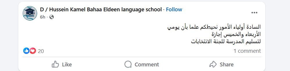 أعلنت عددا من المدارس تعليق الدراسة يومي غد الأربعاء وبعد غد الخميس ، نظراً لإنعقاد لجان اعادة انتخابات مجلس النواب 2025 بفصولها .