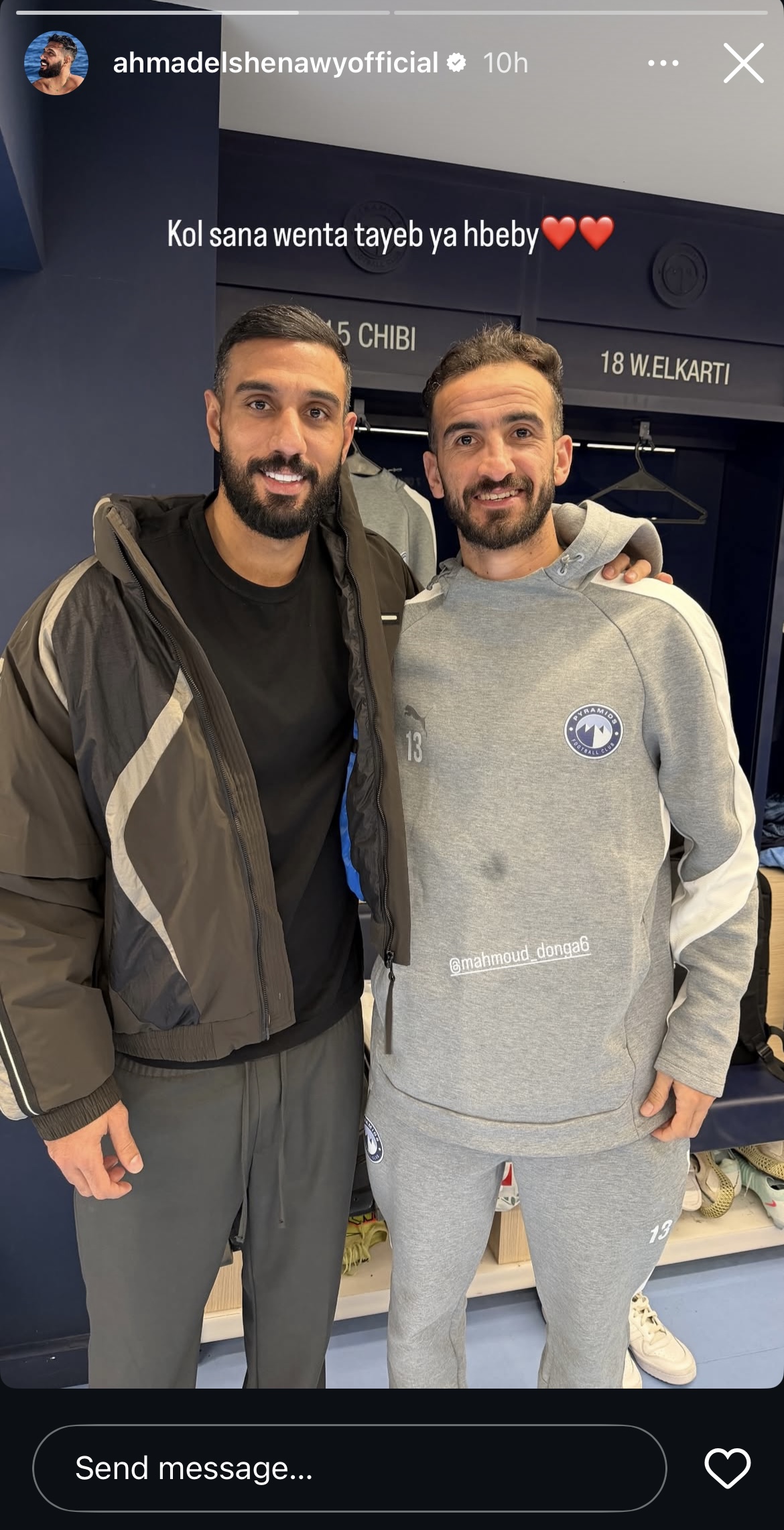 حرص أحمد الشناوي، حارس مرمى بيراميدز على تهنئة زميله بالفريق محمود دونجا بمناسبة عيد ميلاده.