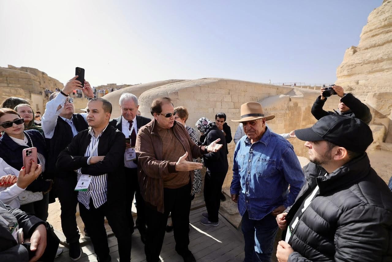 أكد "حواس" للوفود إن الأدلة الأثرية والتاريخية واللغوية تثبت أن بناه الأهرام هم المصريون، وهناك أدلة لغوية مكتوبة داخل مقابر الموظفين والنبلاء تشير إلى خوفو وهرمه، وأن الهرم هو رمز لإله الشمس، وأنه جزء من الأهرامات المصرية التى بنيت منذ الأسرة الثالثة حتى بداية الأسرة الـ18، كما أن مقابر العمال بناه الأهرام تثبت للعالم أجمع أن الهرم كان المشروع القومي لمصر، وأن بناة الأهرام قد عملوا في بناء الهرم لمدة 32 عاما.