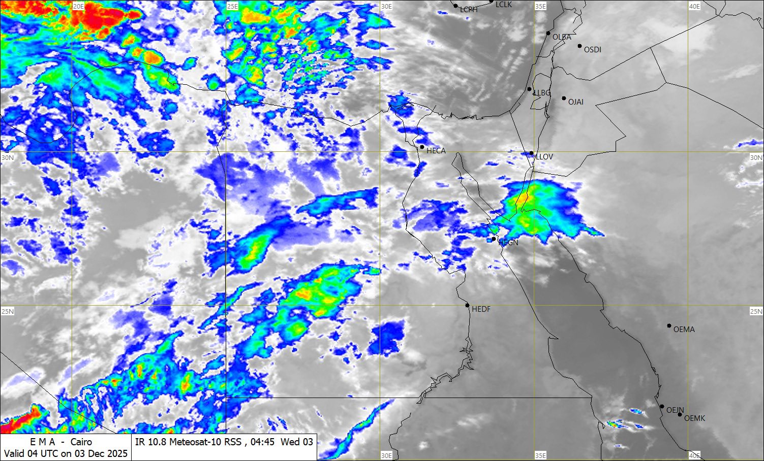 كما تظهر سحب منخفضة، خلال الطقس اليوم، على شمال البلاد حتى القاهرة الكبرى ومدن القناة ووسط سيناء وجنوب البلاد، وقد ينتج عنها سقوط أمطار خفيفة وغير مؤثرة على بعض المناطق.