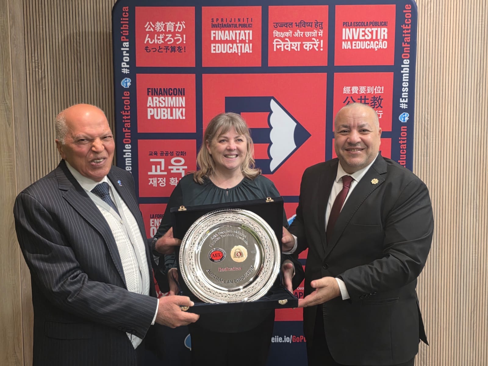 جاء اللقاء في إطار تعزيز التعاون الدولي وتبادل الخبرات المهنية بين نقابات المعلمين حول العالم، بحضور ياسر عرفات الأمين العام لنقابة المعلمين المصرية.
