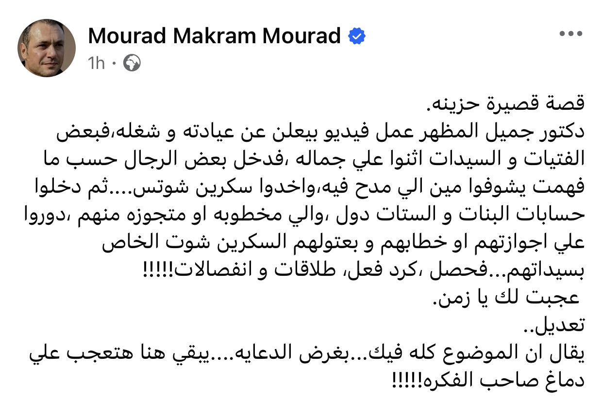 وكتب مراد مكرم عبر حسابه الشخصي بموقع فيسبوك: “قصة قصيرة حزينة..دكتور جميل المظهر عمل فيديو بيعلن عن عيادته و شغله، فبعض الفتيات و السيدات اثنوا علي جماله ،فدخل بعض الرجال حسب ما فهمت يشوفوا مين الي مدح فيه، واخدوا سكرين شوتس، ثم دخلوا حسابات البنات و الستات دول ، والي مخطوبه او متجوزه منهم ،دوروا علي اجوازتهم او خطابهم وبعتولهم السكرين شوت الخاص بسيداتهم...فحصل ،كرد فعل, طلاقات و انفصالات، عجبت لك يا زمن".