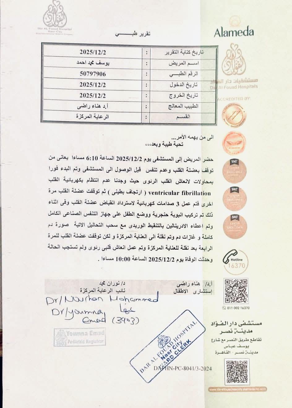 ووفقًا للتقرير، فقد وصل الطفل إلى المستشفى يوم 2 ديسمبر 2025 في تمام الساعة 6:10 مساءً وهو يعاني من توقف كامل في عضلة القلب وانعدام التنفس قبل وصوله.