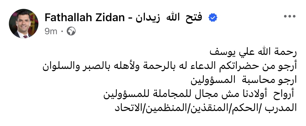 أرجو من حضراتكم الدعاء له بالرحمة ولأهله بالصبر والسلوان ارجو محاسبة المسؤولين، أرواح أولادنا مش مجال للمجاملة للمسؤولين، المدرب، الحكم، المنقذين، المنظمين، الاتحاد".