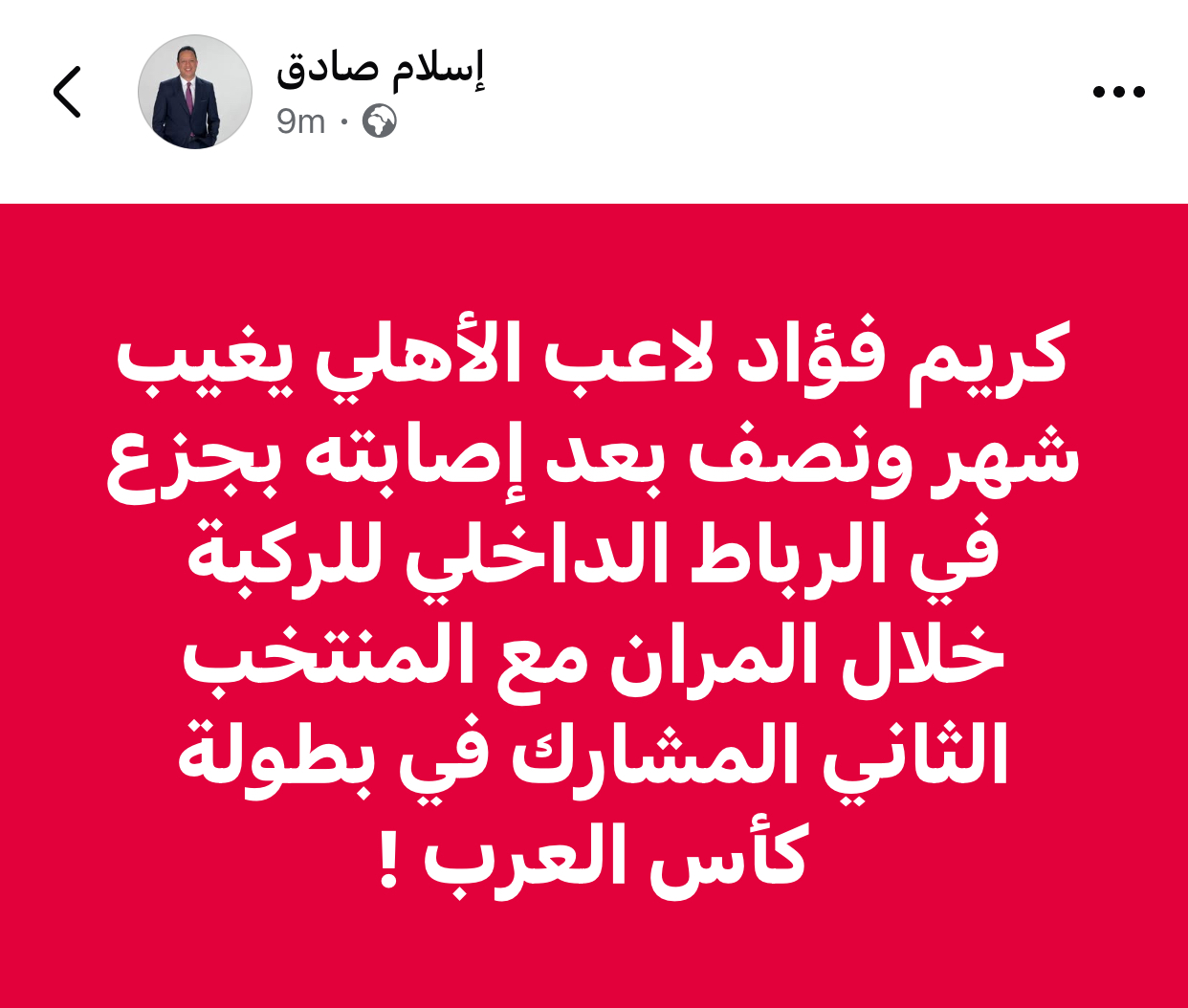 وكتب صادق عبر حسابه الشخصي بموقع فيسبوك: “كريم فؤاد لاعب الأهلي يغيب شهر ونصف بعد إصابته بجزع في الرباط الداخلي للركبة خلال المران مع المنتخب الثاني المشارك في بطولة كأس العرب”.