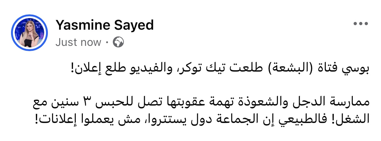 وكتبت الخطيب عبر حسابها الشخصي بموقع فيسبوك: "بوسي فتاة البشعة، طلعت تيك توكر، والفيديو طلع إعلان".