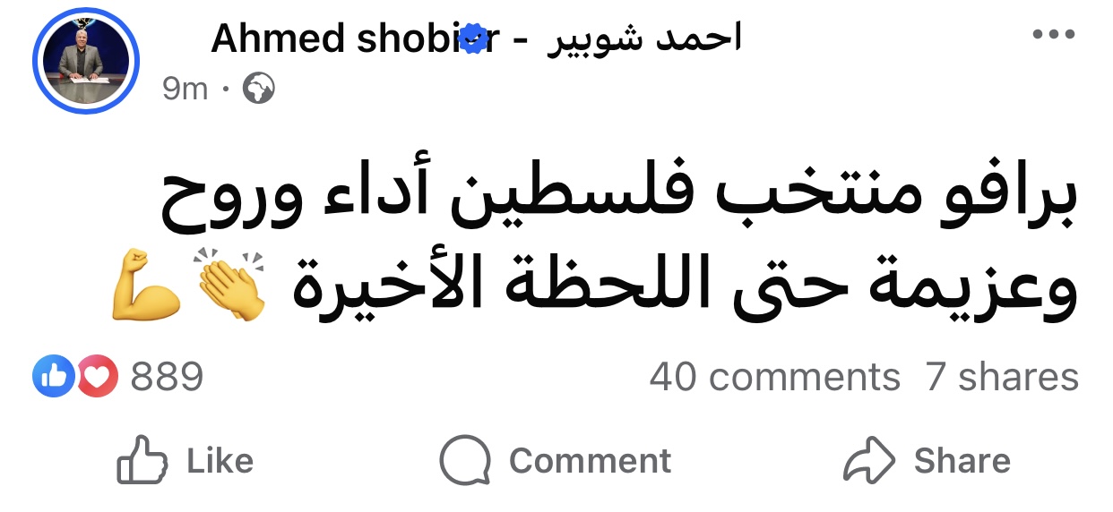 وكتب شوبير على حسابه الشخصي بموقع فيسبوك: "برافو منتخب فلسطين أداء وروح وعزيمة حتى اللحظة الأخيرة".