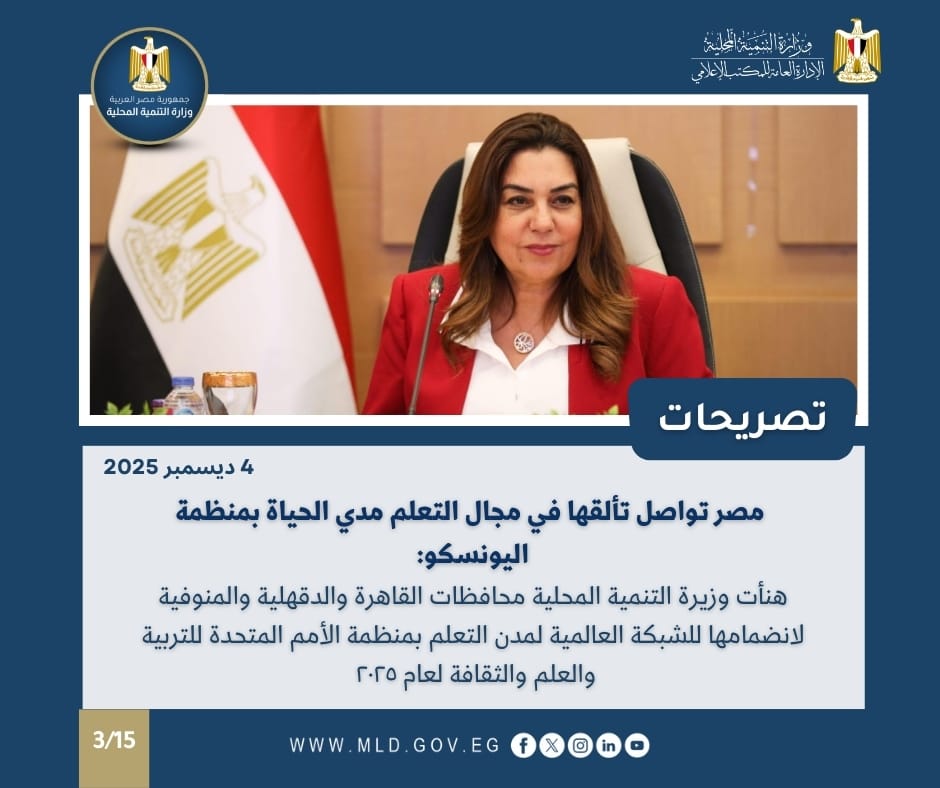 كما أعلنت الدكتورة منال عوض وزيرة التنمية المحلية ، عن انضمام ثلاث مدن مصرية جديدة هي: القاهرة و المنصورة (محافظة الدقهلية)، وشبين الكوم (محافظة المنوفية) إلى الشبكة العالمية لمدن التعلم لعام 2025، التابعة لمنظمة الأمم المتحدة للتربية والعلم والثقافة (اليونسكو) ليصبح إجمالي عدد المدن المصرية الأعضاء في الشبكة 10 مدن، في إنجاز يعكس التقدم المستمر الذي تحققه مصر في دعم التعلم مدى الحياة والتنمية البشرية المستدامة.