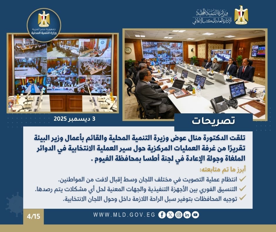 تلقت الدكتورة منال عوض وزيرة التنمية المحلية والقائم بأعمال وزير البيئة، تقريرًا من غرفة العمليات المركزية بمركز الشبكة الوطنية للطوارئ والسلامة العامة بالوزارة حول سير عمليات التصويت في المحافظات التي تشهد انتخابات مجلس النواب 2025، بالدوائر الـ19 الملغاة بقرار من الهيئة الوطنية للانتخابات في المرحلة الأولى، إلى جانب جولة الإعادة في لجنة أطسا بمحافظة الفيوم.