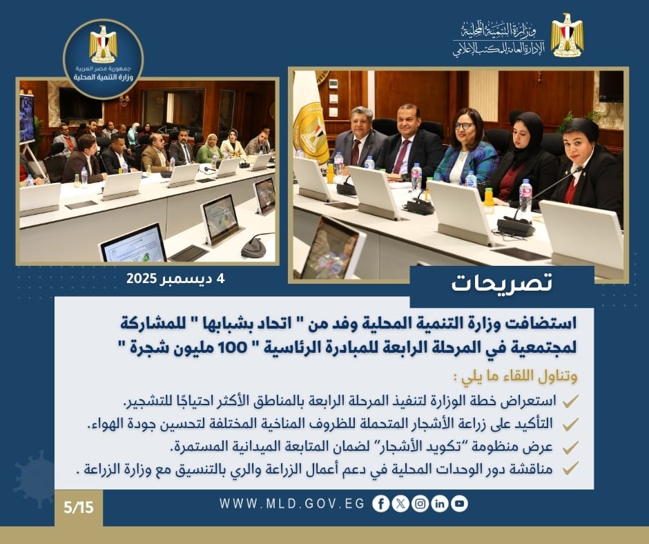 كما استضافت وزارة التنمية المحلية بالعاصمة الجديدة وفداً من "اتحاد بشبابها" التابع لوزارة الشباب والرياضة ، في إطار جهود الوزارة لتعزيز المشاركة المجتمعية والاهتمام بالشباب من مختلف محافظات الجمهورية و للمشاركة في تنفيذ المرحلة الرابعة من المبادرة الرئاسية "100 مليون شجرة" خلال العام المالي 2025- 2026 ضمن جهود الدولة لتعزيز المساحات الخضراء والحد من التلوث.