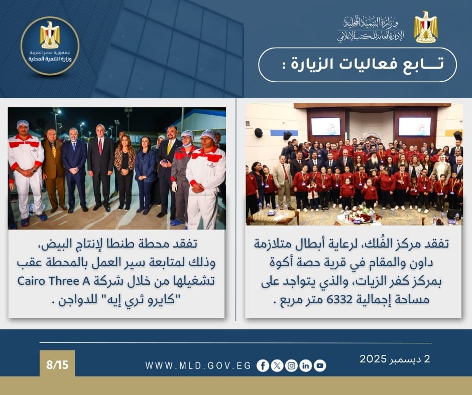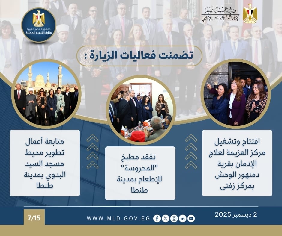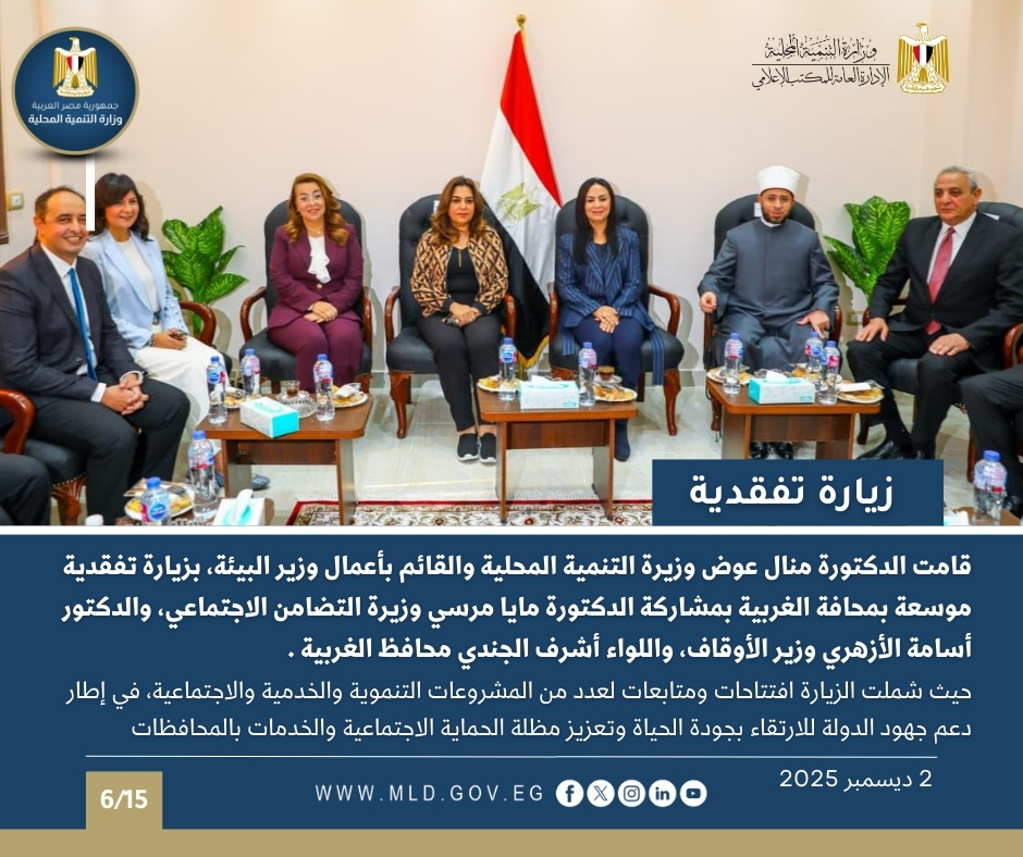 قامت للدكتورة منال عوض وزيرة التنمية المحلية والقائم بأعمال وزير البيئة، بزيارة تفقدية موسعة بمحافة الغربية بمشاركة الدكتورة مايا مرسي وزيرة التضامن الاجتماعي، والدكتور أسامة الأزهري وزير الأوقاف، واللواء أشرف الجندي محافظ الغربية، حيث شملت الزيارة افتتاحات ومتابعات لعدد من المشروعات التنموية والخدمية والاجتماعية، في إطار دعم جهود الدولة للارتقاء بجودة الحياة وتعزيز مظلة الحماية الاجتماعية والخدمات بالمحافظات، وتضمنت فعاليات الزيارة الآتي: