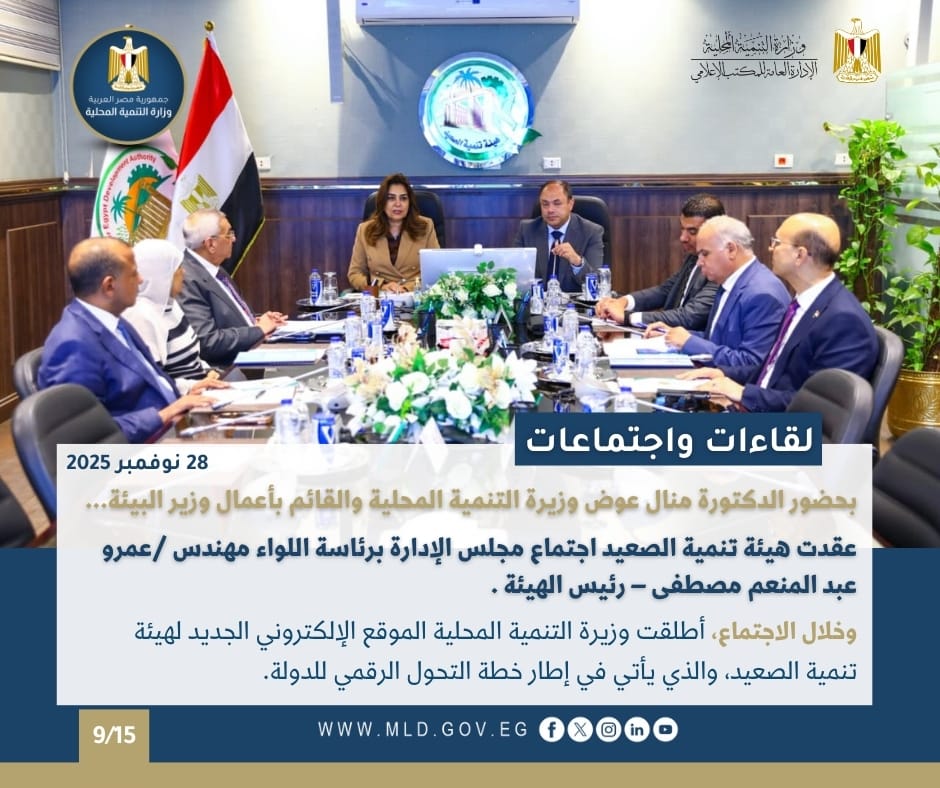 عقدت هيئة تنمية الصعيد اجتماع مجلس الإدارة برئاسة اللواء مهندس عمرو عبد المنعم مصطفى رئيس الهيئة، وبحضور الدكتورة منال عوض وزيرة التنمية المحلية والقائم بأعمال وزير البيئة، إضافة إلى أعضاء المجلس الممثلين لكافة الوزارات والجهات المعنية، وخلال الاجتماع، قامت الدكتورة منال عوض بإطلاق الموقع الإلكتروني الجديد لهيئة تنمية الصعيد، والذي يأتي في إطار خطة التحول الرقمي للدولة، ويهدف إلى تعزيز التواصل مع المستثمرين، وإتاحة المعلومات والفرص الاستثمارية، وعرض مشروعات الهيئة وإنجازاتها بشكل محدث وديناميكي، بما يدعم جهود الشفافية وتسهيل الخدمات المقدمة.
