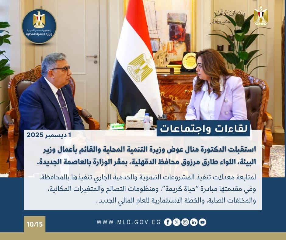 واستقبلت الدكتورة منال عوض وزيرة التنمية المحلية والقائم بأعمال وزير البيئة، اللواء طارق مرزوق محافظ الدقهلية بمقر الوزارة بالعاصمة الجديدة، لمتابعة الموقف التنفيذي للمشروعات الخدمية والتنموية التى تمس حياة المواطنين بالمحافظة.