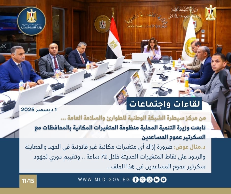 كما عقدت الدكتورة منال عوض وزيرة التنمية المحلية ، اجتماعاً عبر الفيديو كونفرانس مع جميع السكرتيري العموم المساعدين بمحافظات الجمهورية لمتابعة منظومة المتغيرات المكانية وذلك من مقر مركز سيطرة الشبكة الوطنية للطوارئ والسلامة العامة بحضور الدكتور سعيد حلمي رئيس قطاع الإدارة الإستراتيجية والتنمية المحلية رئيس اللجنة الوزارية المشكلة بقرار من الوزيرة وأعضاء اللجنة والخاصة بمتابعة منظومة المتغيرات المكانية والتقنين والمراكز التكنولوجية.
