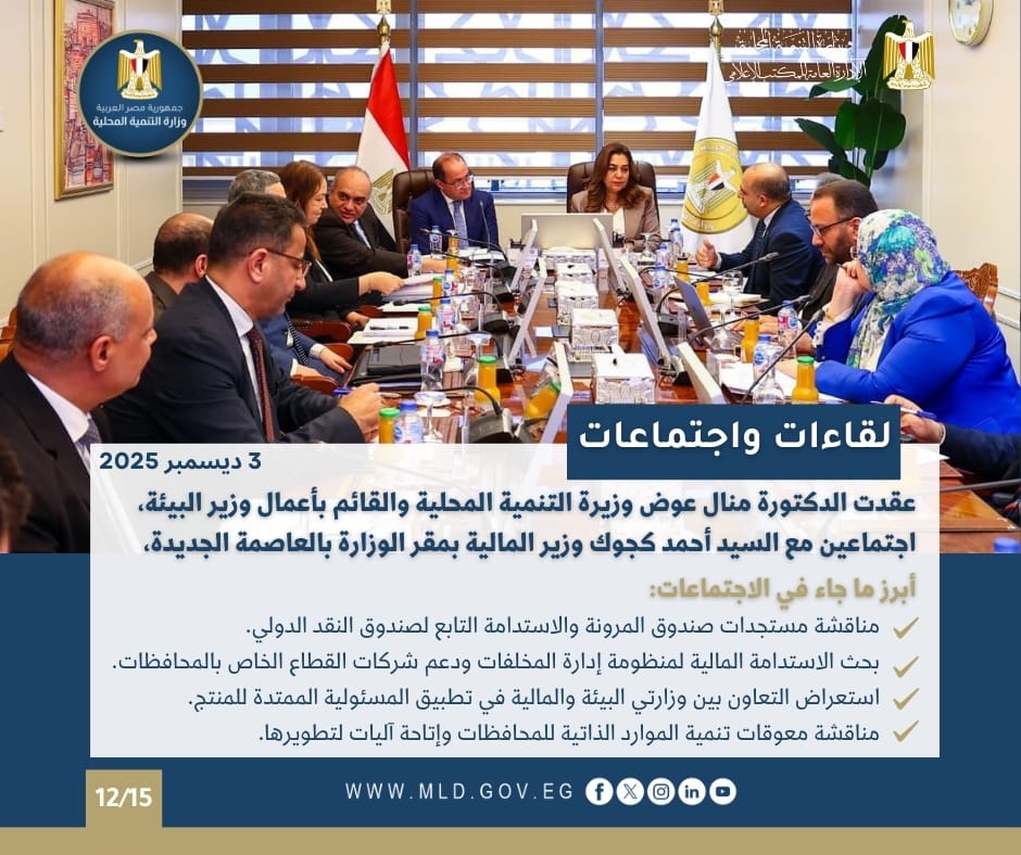 عقدت الدكتورة منال عوض وزيرة التنمية المحلية والقائم بأعمال وزير البيئة، اجتماعين مع أحمد كجوك وزير المالية بمقر وزارة التنمية المحلية بالعاصمة الجديدة وذلك بحضور ياسر صبحي نائب وزير المالية للسياسات المالية وعدد من مساعدي ومستشاري وقيادات وزارات المالية والتنمية المحلية والبيئة.
