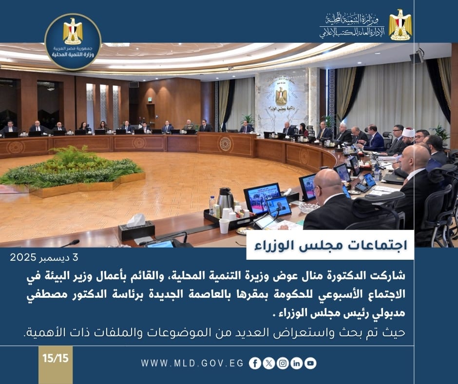 كما شاركت الدكتورة منال عوض وزير التنمية المحلية والقائم بأعمال وزير البيئة، في الاجتماع الأسبوعي للحكومة برئاسة الدكتور مصطفى مدبولي، رئيس مجلس الوزراء، بالعاصمة الجديدة؛ وذلك لمناقشة عدد من الملفات والموضوعات.