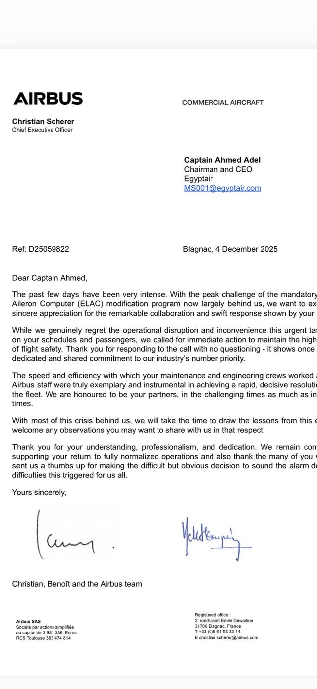 نشر الطيار أحمد عادل رئيس الشركة القابضة لمصر للطيران، نص خطابًا أرسلته شركة إيرباص العالمية موجه إلي فرق الناقل الوطني مصر للطيران وعملاءه أيضًا، الذي تأثروا خلال اليومين الماضيين، نتيجة المشكلة الفنية التي أصابت حاسوب ELAC، وأجرت على إثرها مصر للطيران تحدثيات لهذا الجهاز.