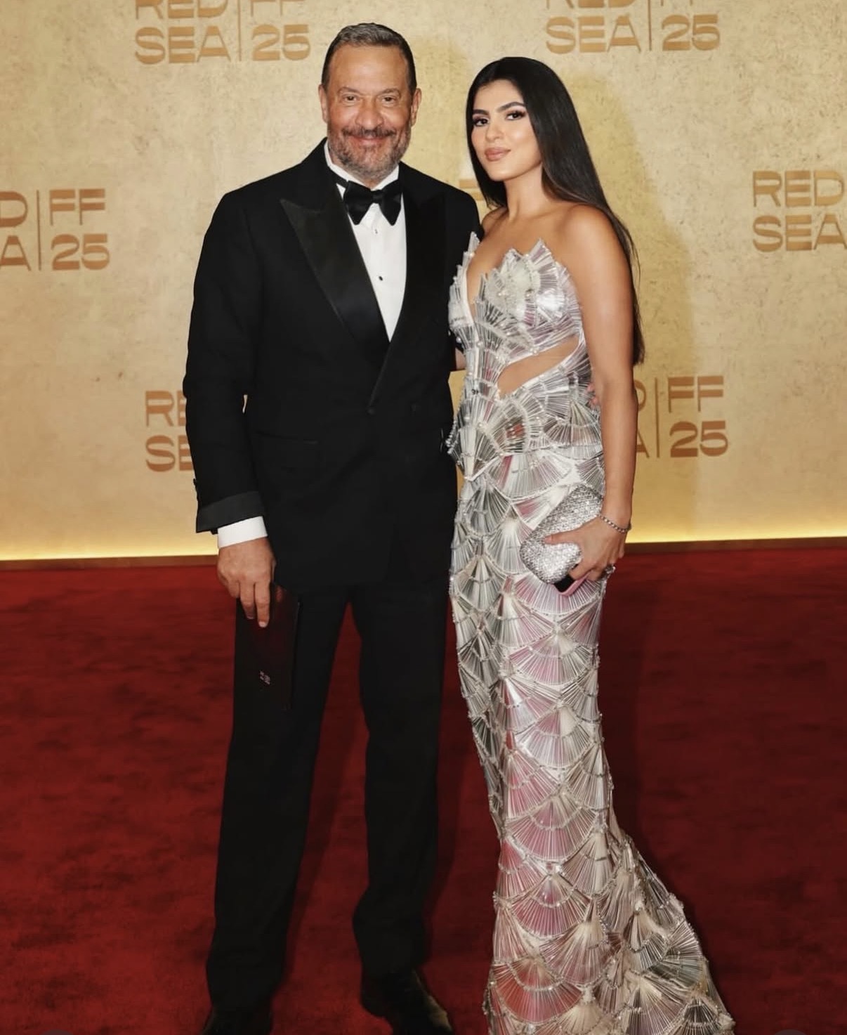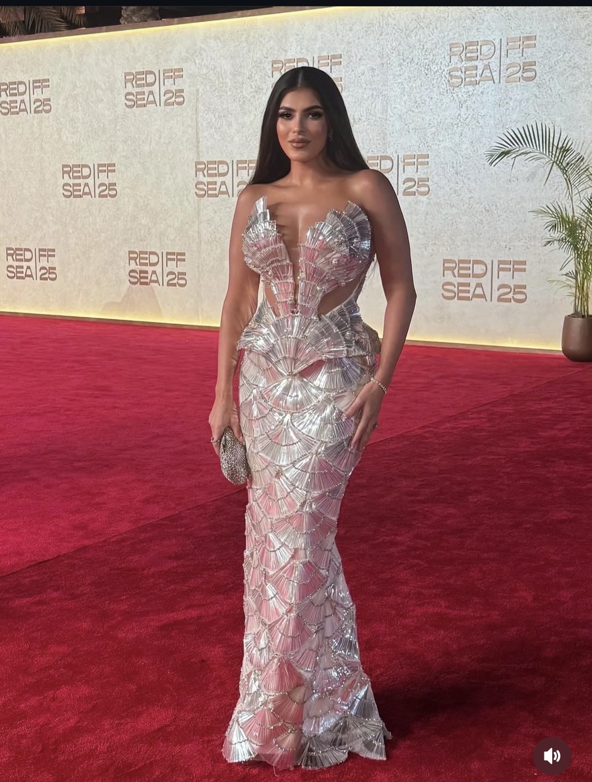تألقت زوجة ماجد المصري في الصور بإطلالة كشفت عن ذوقها الأنيق، حيث ارتدت فستان طويل ذا أكمام مكشوفة باللون الفضي.