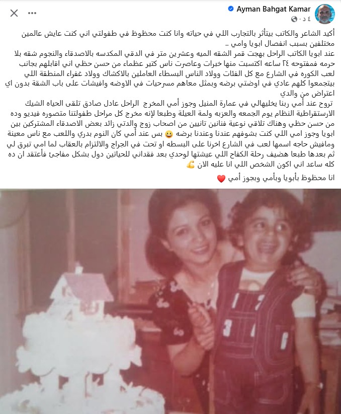 نشر الشاعر الغنائى أيمن بهجت قمر تعليقا مثيرا عبر صفحته على موقع التواصل الاجتماعي فيسبوك يتحدث فيها عن فترة طفولته وكيف تشكل وجدانه.