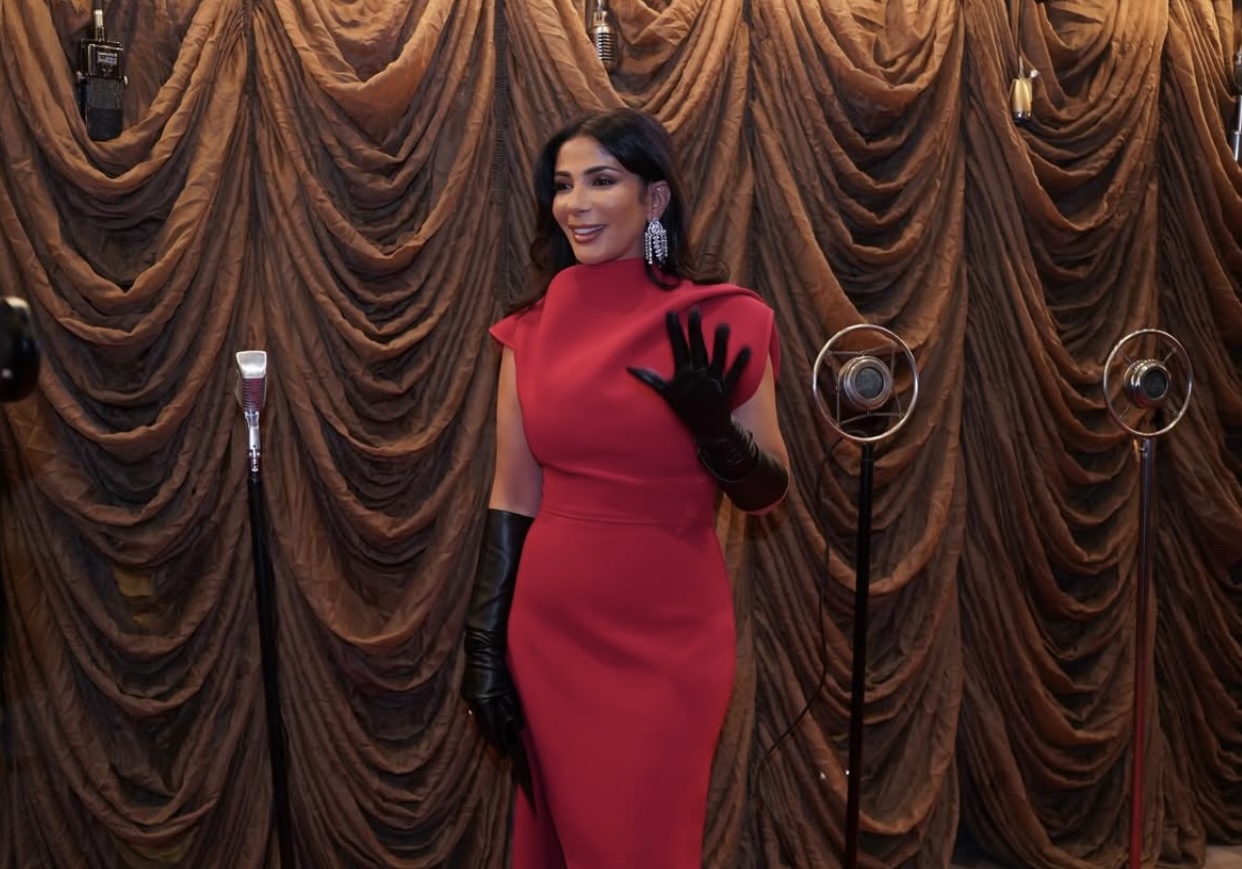 وتألقت منى زكي حيث ارتدت فستان باللون الأحمر، مع قفازات جلد باللون الأسود وحقيبة بنفس اللون، ونسقت اكسسوارات ملائمة لإطلالتها.