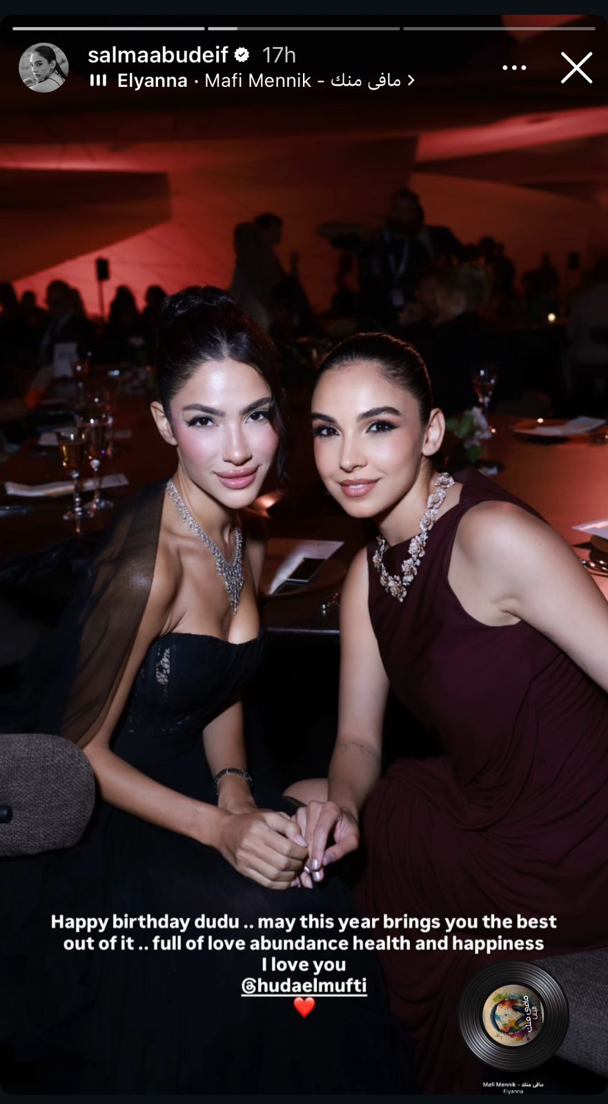 وشاركت سلمى أبو ضيف صورة مع هدى المفتي عبر موقع التواصل الاجتماعي انستجرام، وكتبت: “عيد ميلاد سعيد دودو يارب السنة دي تجبلك الأفضل، وتكون مليئة بالسعادة والحب ..بحبك”.