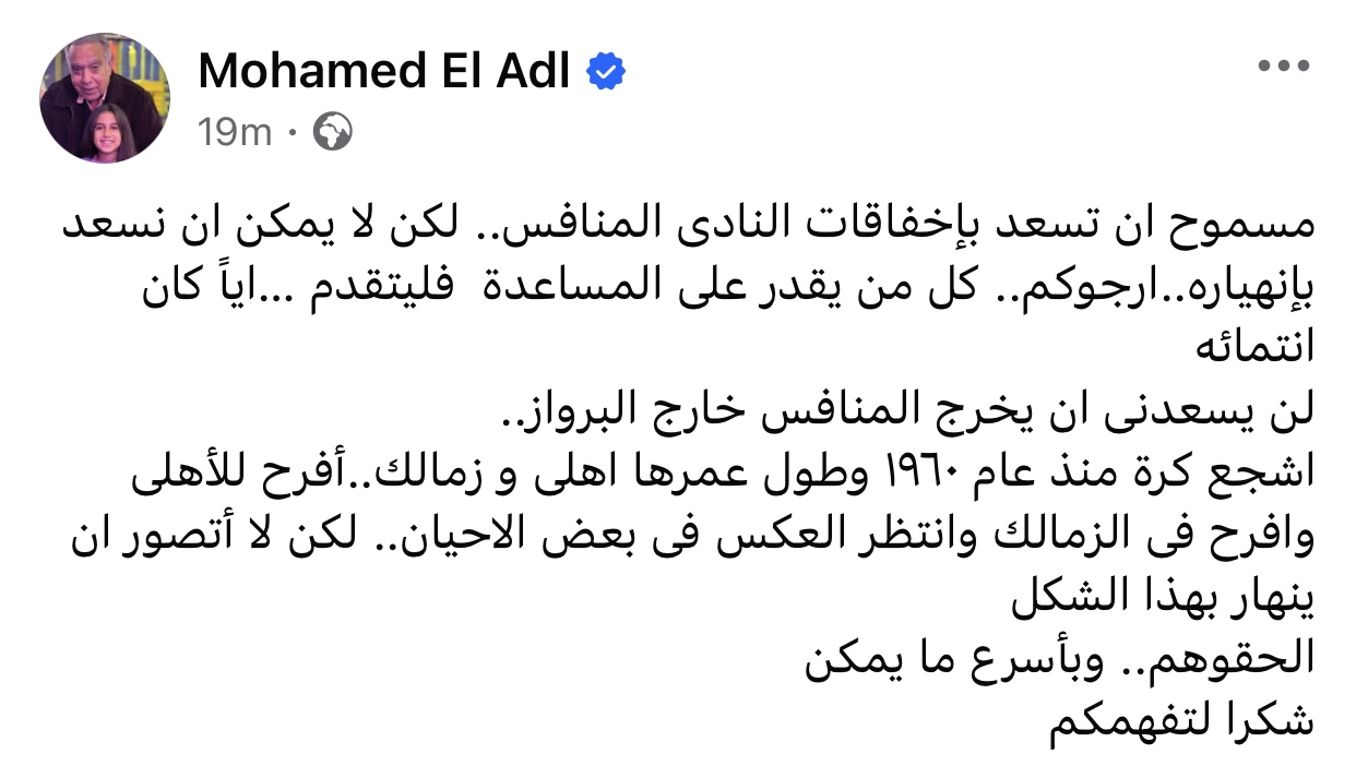 وكتب العدل عبر حسابه الشخصي بموقع فيسبوك: “مسموح ان تسعد بإخفاقات النادى المنافس، لكن لا يمكن ان نسعد بإنهياره، ارجوكم كل من يقدر على المساعدة فليتقدم إيًا كان انتمائه”.