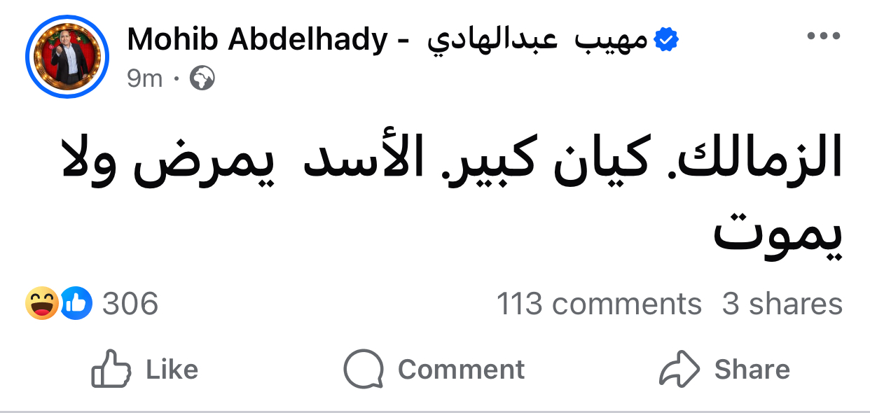 وكتب مهيب عبر حسابه الشخصي بموقع فيسبوك: “الزمالك كيان كبير، الأسد يمرض ولا يموت”.