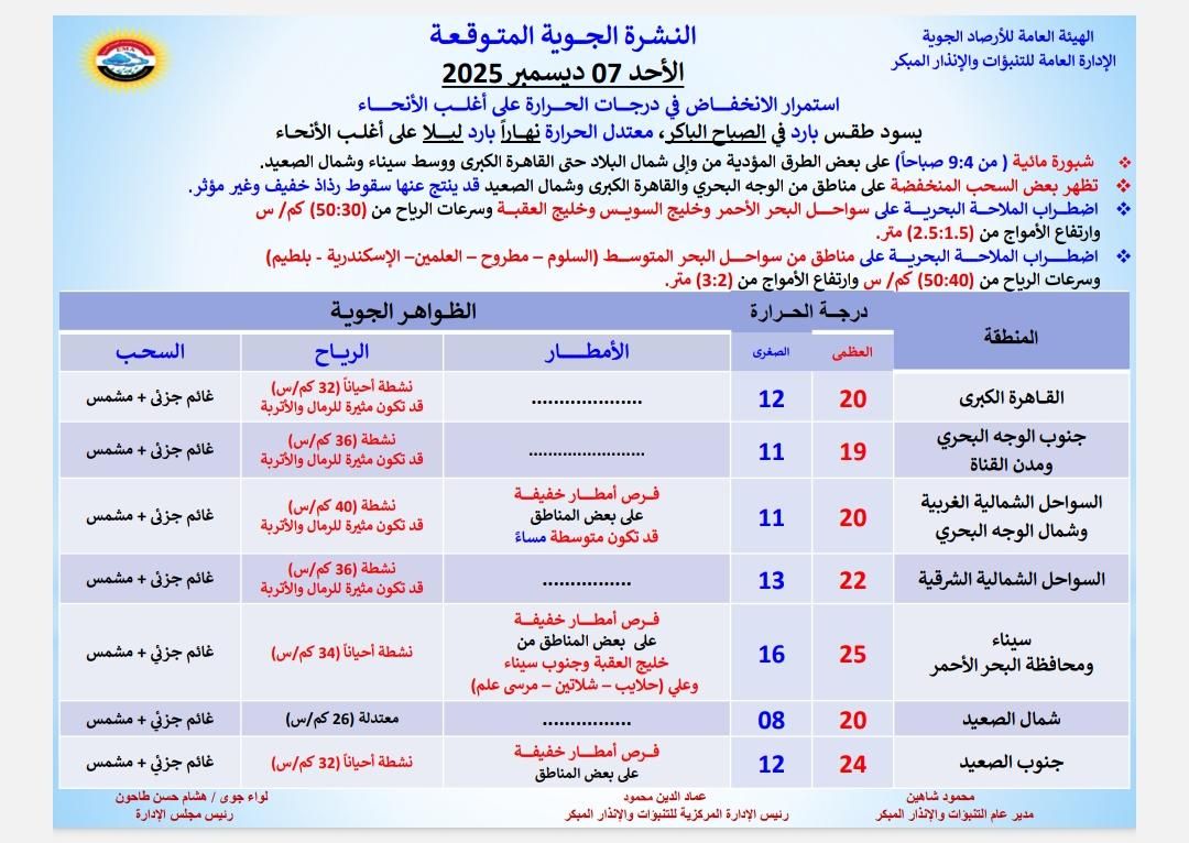 وعن الظواهر الجوية فرص لسقوط أمطار خفيفة على مناطق متفرقة من السواحل الشمالية الغربية وشمال الوجه البحري قد تكون متوسطة مساء على بعض المناطق على فترات متقطعة، وفرص لسقوط أمطار خفيفة على مناطق متفرقة من خليج العقبة وجنوب سيناء وعلى حلايب وشلاتين ومرسى علم وعلى مناطق من جنوب الصعيد على فترات متقطعة، وتنشط رياح على مناطق من جنوب سيناء وجنوب الصعيد قد تكون مثيرة للرمال والأتربة على مناطق من السواحل الشمالية والوجه البحري والقاهرة الكبرى على فترات متقطعة.