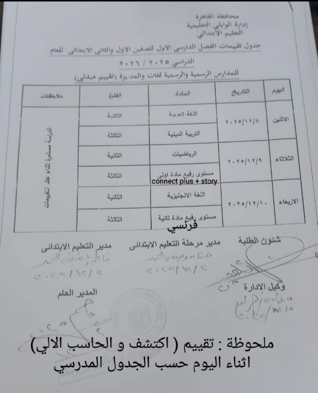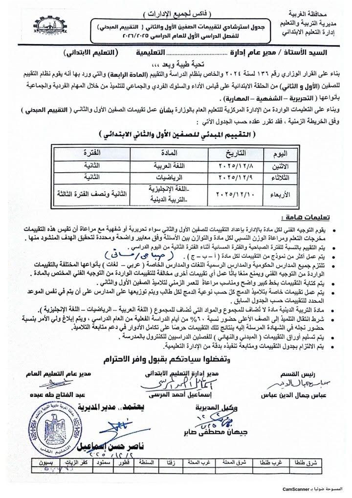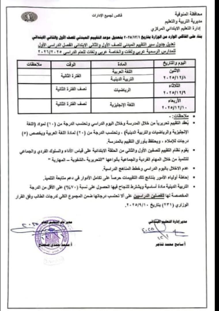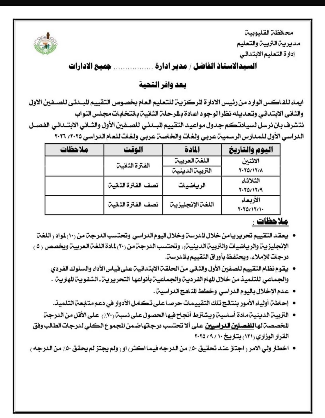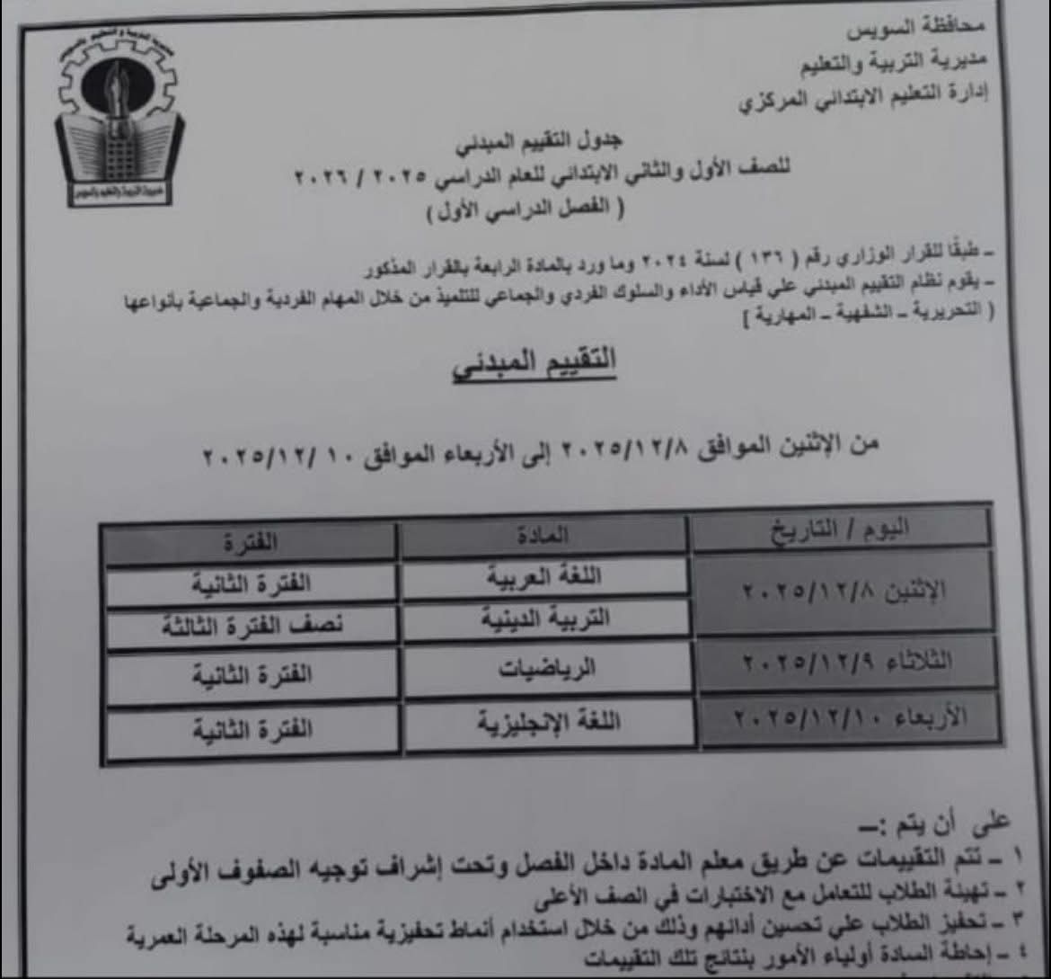 ويستمر التقييم المبدئي للصفين الأول والثاني الإبتدائي في المحافظات المذكورة من 8 لـ 10 ديسمبر 2025 ،