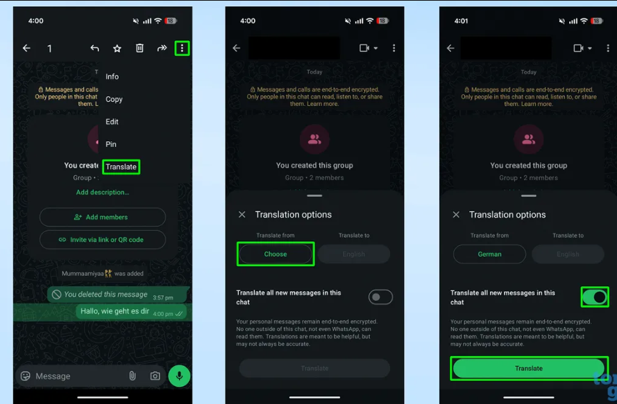أضاف "واتساب" مؤخرا ميزة الترجمة المدمجة داخل التطبيق، التي تتيح لك ترجمة الرسائل من أي لغة إلى أخرى بكل سهولة، يمكنك الضغط على الرسالة لمدة طويلة، ثم اختيار "ترجمة" من قائمة الخيارات، كما يمكنك تفعيل الترجمة التلقائية لجميع الرسائل في محادثة معينة لتكون مترجمة تلقائيا عند تلقيها.