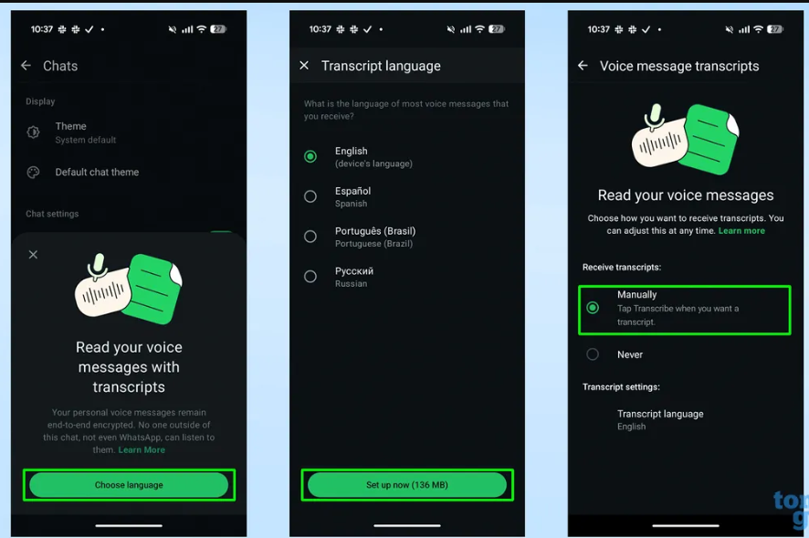 أضاف "واتساب" ميزة تحويل الرسائل الصوتية إلى نصوص، بحيث يمكنك قراءة محتوى الرسالة الصوتية دون الحاجة للاستماع إليها، يمكنك تفعيل هذه الميزة عبر الإعدادات واختيار “نسخ الرسائل الصوتية”، بعد تفعيلها، ستحصل على نصوص مترجمة من الرسائل الصوتية التي تتلقاها.