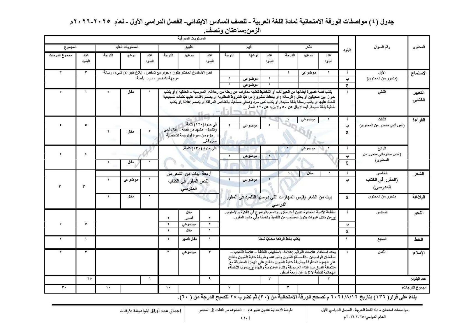 وأرسلت وزارة التربية والتعليم والتعليم الفني ، خطابا رسميا للمديريات التعليمية كشفت خلاله عن عدد الأسئلة ونوعها ودرجات كل سؤال في المحتوي “ الاستماع والتعبير والقراءة والشعر والبلاغة والنحو والخط والإملاء”.