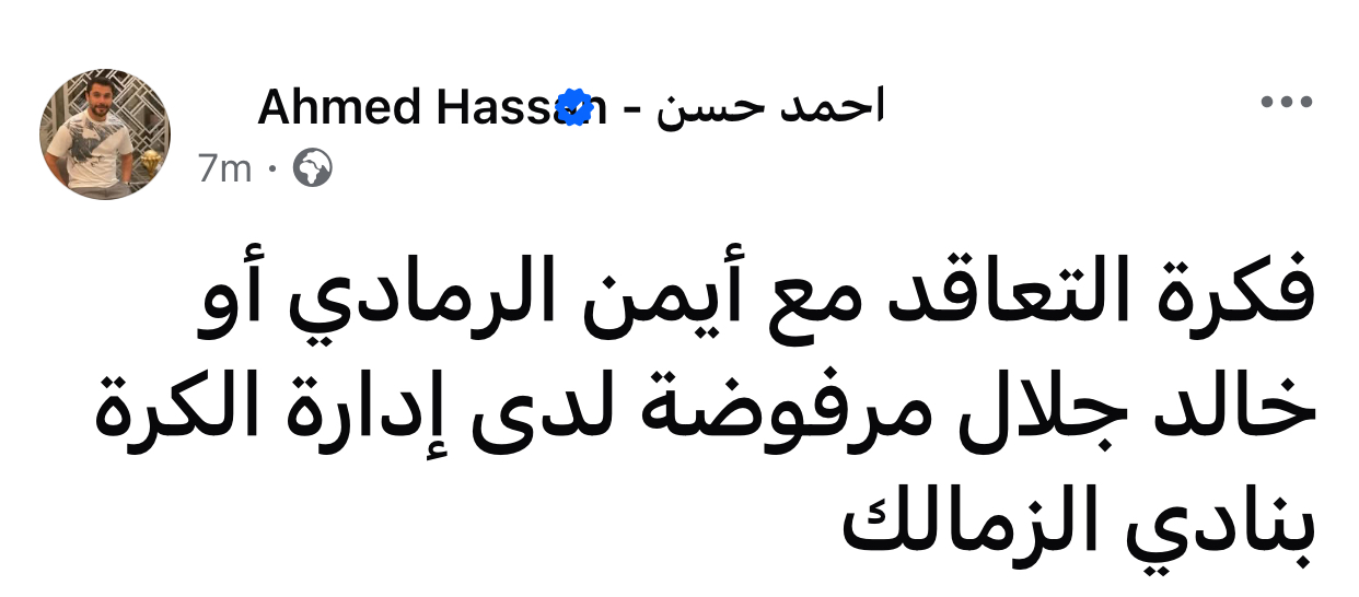وكتب أحمد حسن على حسابه الشخصي بموقع فيسبوك: “فكرة التعاقد مع أيمن الرمادي أو خالد جلال مرفوضة لدى إدارة الكرة بنادي الزمالك”.