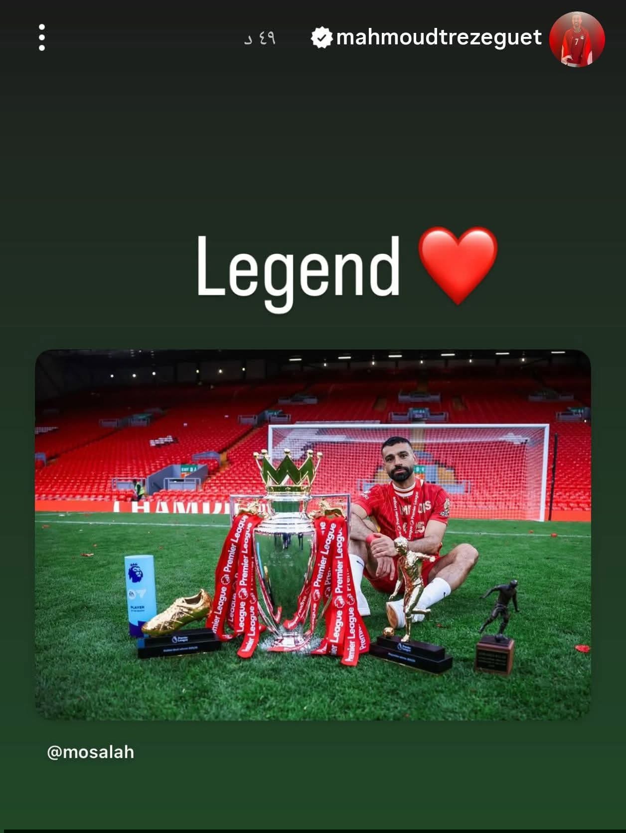 وشارك تريزيجيه صورة لصلاح عبر ستوري انستجرام وعلق :"أسطورة" .