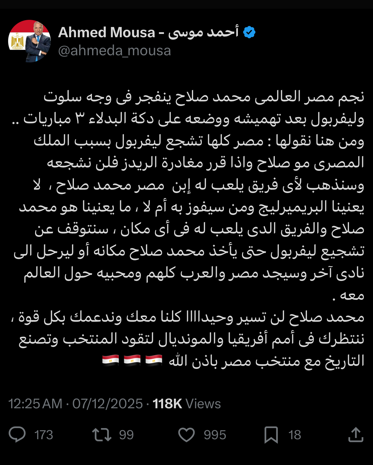 وكتب موسى عبر حسابه الشخصي على منصة إكس: “نجم مصر العالمى محمد صلاح ينفجر فى وجه سلوت وليفربول بعد تهميشه ووضعه على دكة البدلاء ٣ مباريات”.