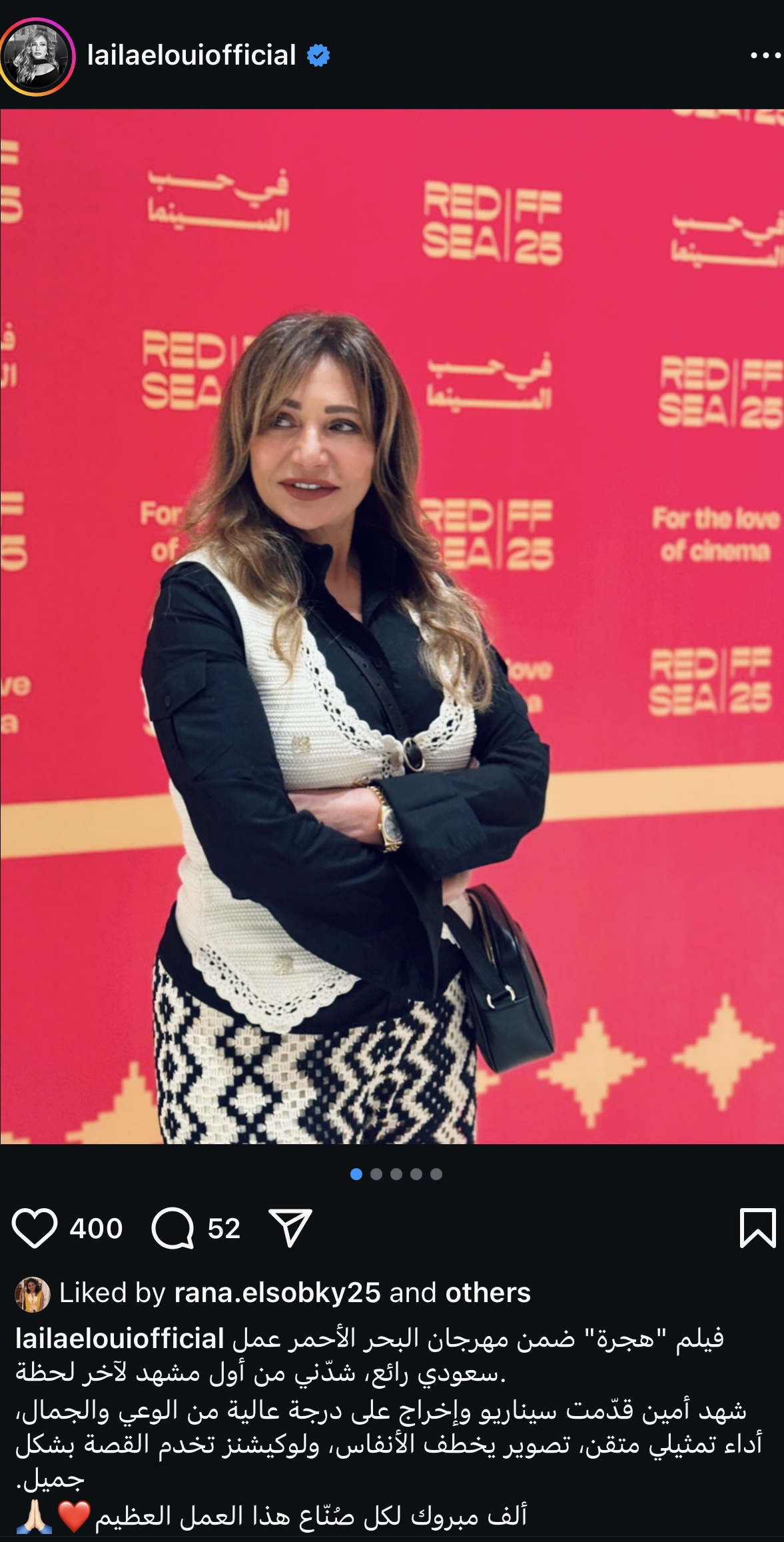 وكتبت ليلى علوي عبر حسابها الشخصي بموقع إنستجرام: "فيلم "هجرة" ضمن مهرجان البحر الأحمر عمل بسعودي رائع، شدّني من أول مشهد لآخر لحظة".
