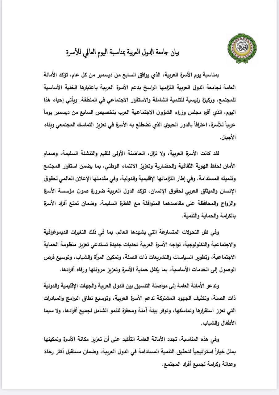 وأشار البيان إلى أن التحولات المتسارعة التي يشهدها العالم، بما في ذلك التغيرات الديموغرافية والاجتماعية والتكنولوجية، تفرِض تحديات جديدة على الأسرة العربية، ما يستدعي تعزيز منظومة الحماية الاجتماعية، وتطوير السياسات والتشريعات ذات الصلة، وتمكين المرأة والشباب، وتوسيع فرص الوصول إلى الخدمات الأساسية بما يكفل حماية الأسرة وتعزيز ركائزها ورفاه أفرادها.